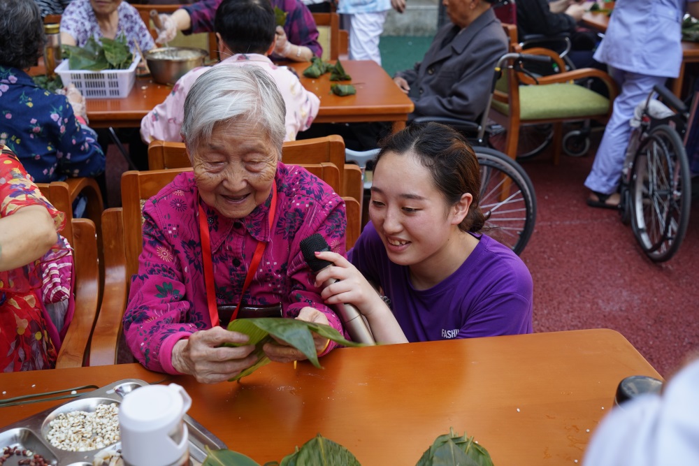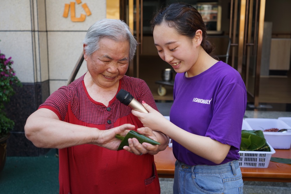 老人們自己動(dòng)手包粽子迎端午,捧著香噴噴的粽子,老人們臉上洋溢著幸福的笑容。饒碧靜婆婆說(shuō):“每逢節(jié)日鶴鳴山老年養(yǎng)護(hù)中心都會(huì)舉辦一些活動(dòng)陪我們過(guò)節(jié),我們很開(kāi)心、很快樂(lè),希望鶴鳴山老年養(yǎng)護(hù)中心越辦越好?!别B(yǎng)護(hù)中心空氣中彌漫著粽子的芳香,耳畔不時(shí)傳來(lái)老人們幸福的笑聲。